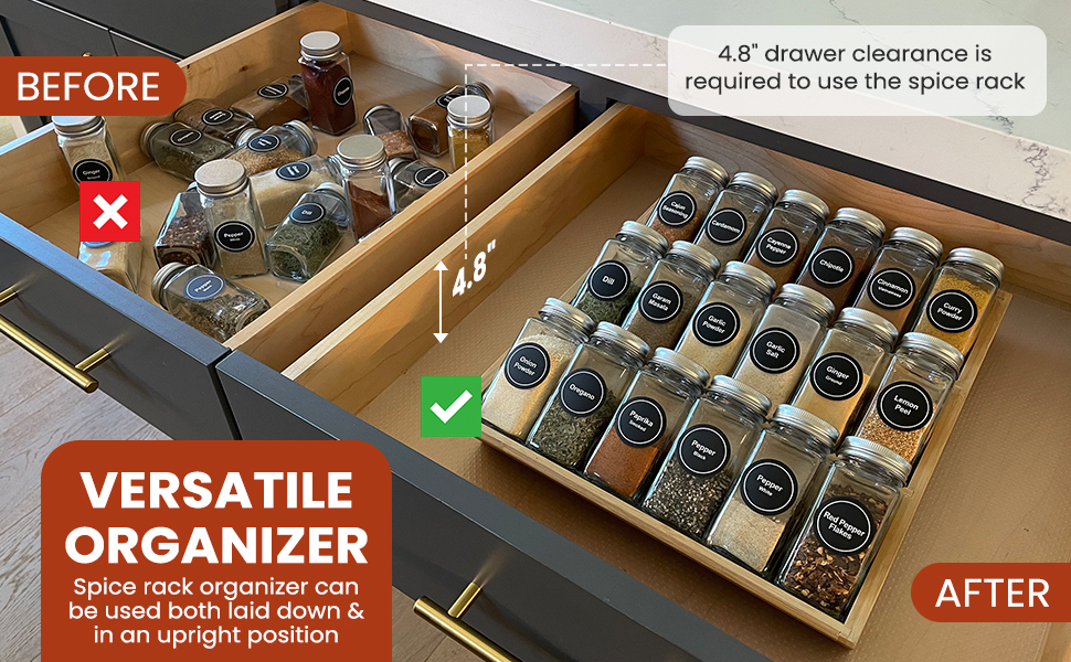 - Our free-standing spice rack organizer can be used both laid down and in an upright position. This product requires a drawer clearance of at least 4.8 inches with standard spice jars. It makes the perfect spice jars display on the countertop and fits nicely in your drawer and cabinet