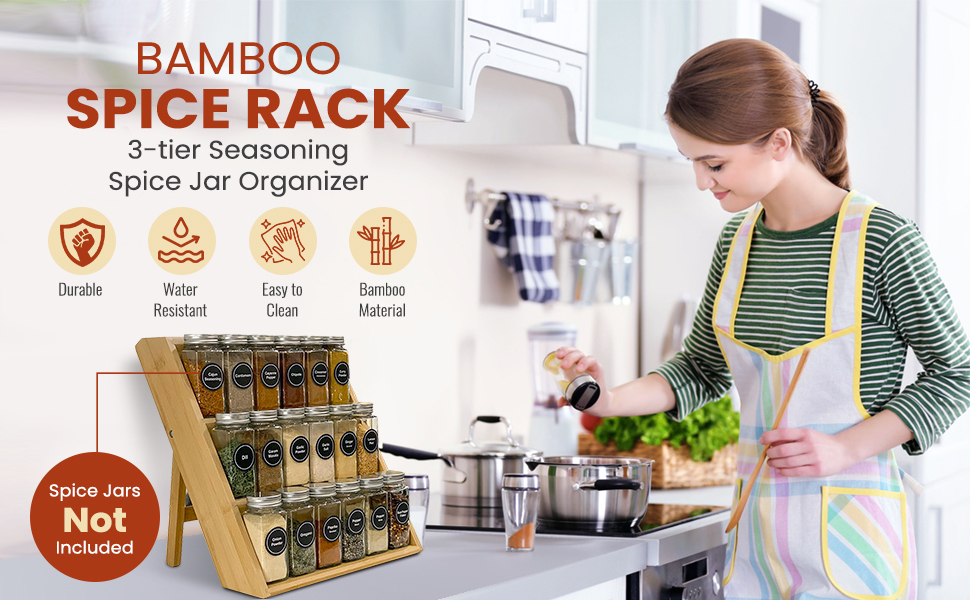 - The 3-tier wooden spice racks free standing helps you to neatly organize the spice jars that take up a lot of room in your drawers, cupboards, and cabinets. It also enables you to display your spice collections elegantly on the countertop and allows you to use the kitchen space more efficiently