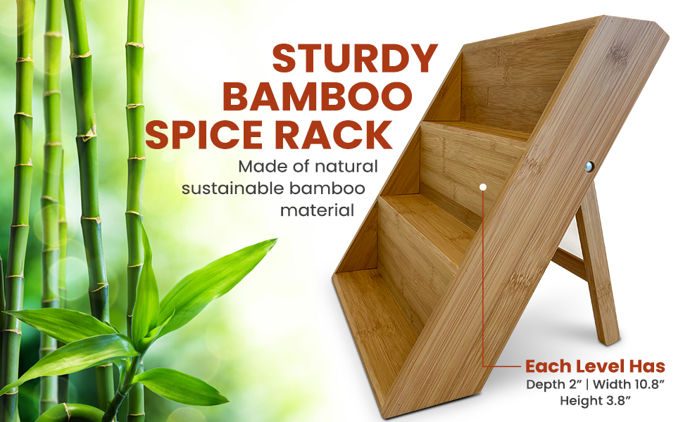- The wooden display spice rack organizer is made of natural eco-friendly bamboo material that has been cultivated under years of experience to guarantee a long service life. It also has a smooth finish to keep you and your child safe and away from getting splinters. Our superior wing-nut and carriage bolt design improves stability in the back leg of the rack, while still allowing the rack to easily lie flat if you want to put it in a drawer