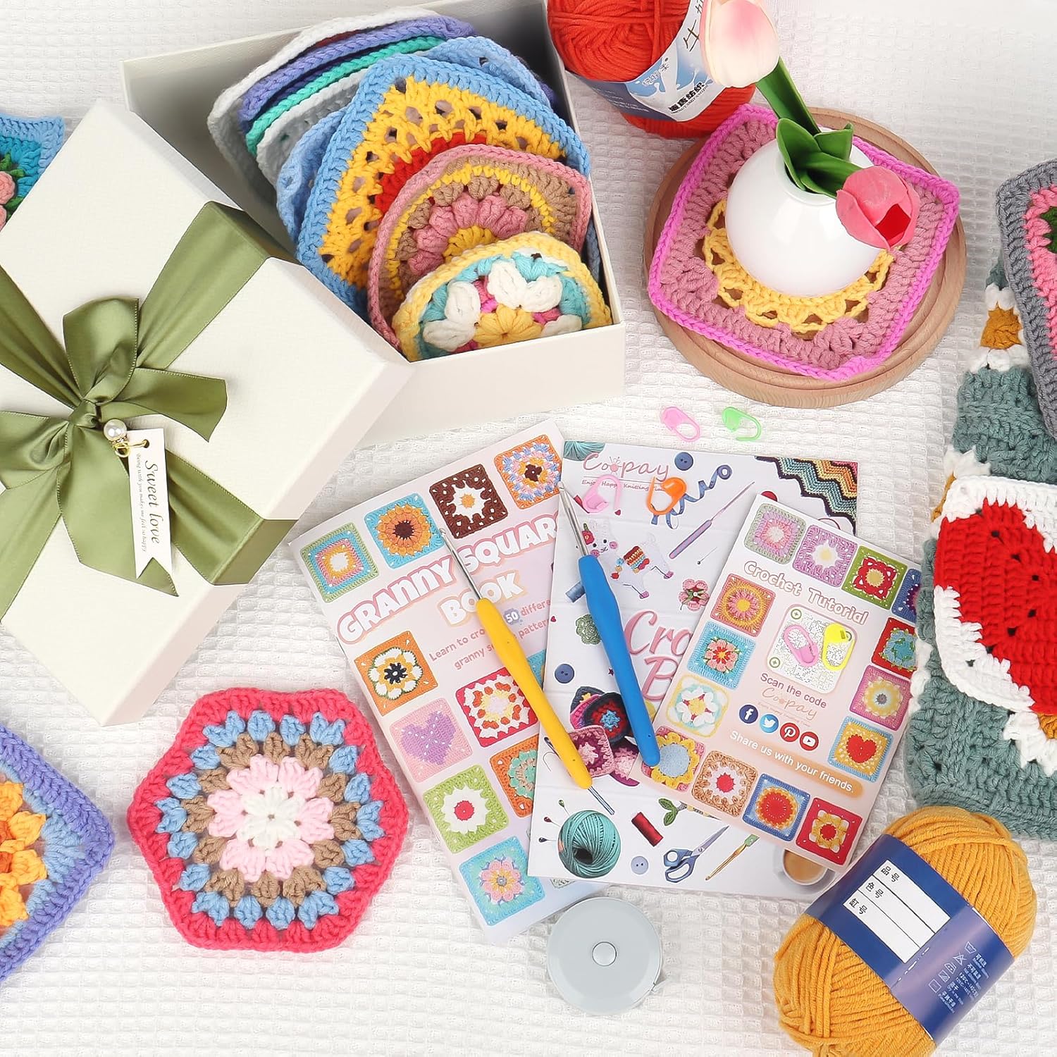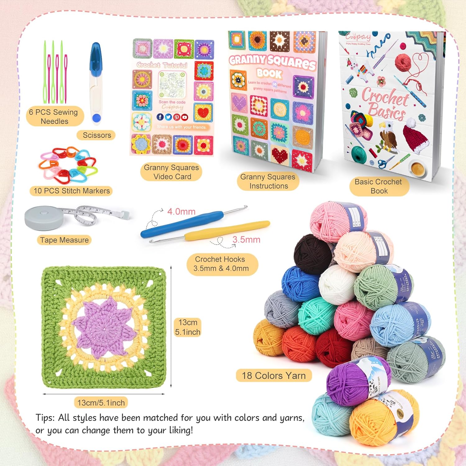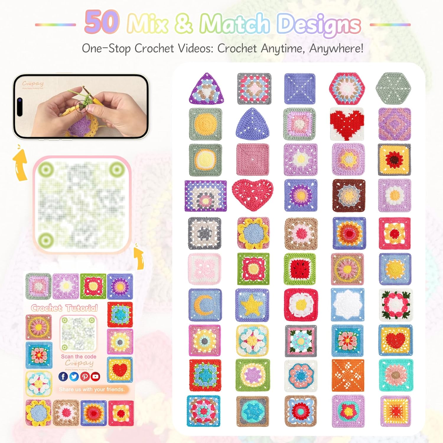 Coopay granny square card deck contains 50 easy to learn and highly creative patterns to ease you into the world of granny square crochet.The granny square card deck crochet kit includes three stages of difficulty and is ideal for beginners who want to master granny square crochet. Coopay granny square crochet kit includes 3 levels of difficulty, making it ideal for beginners who want to master granny square card deck crochet