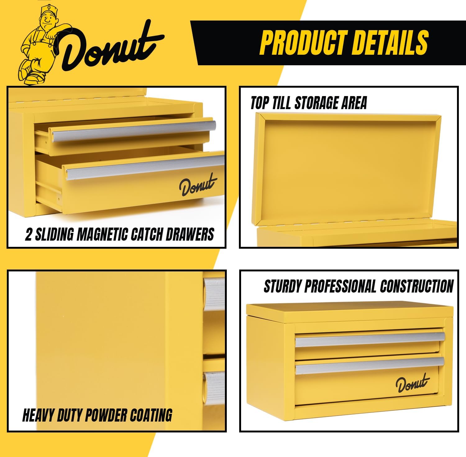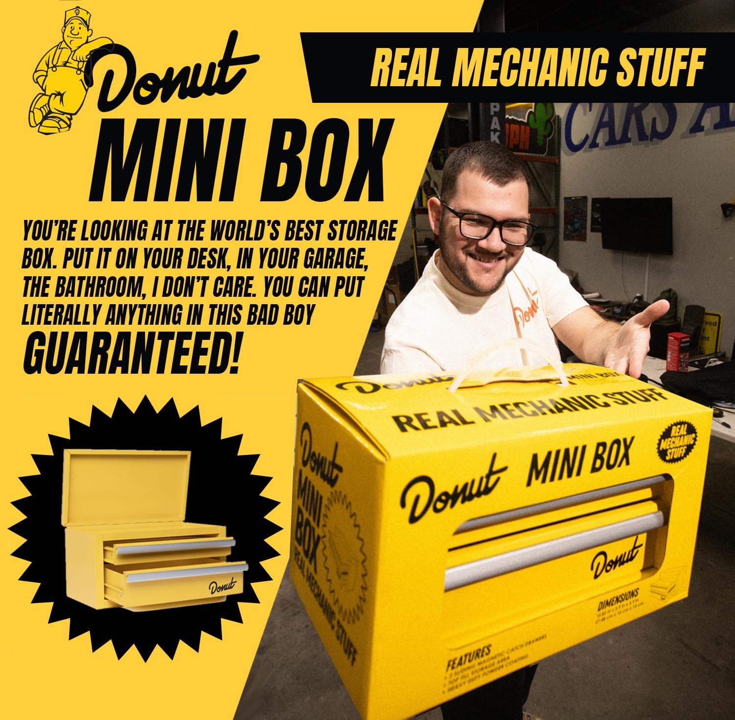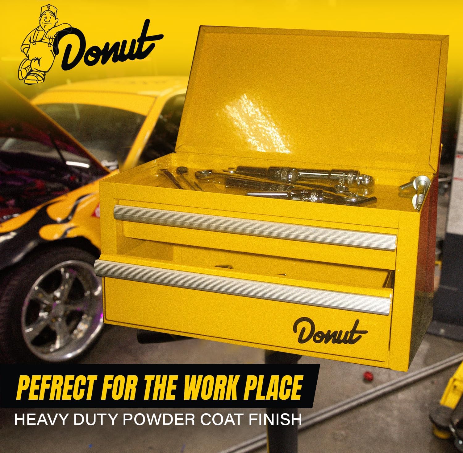 • Created in collaboration with Donut Media, this toolbox embodies the brand’s commitment to quality and fun. It’s more than a storage solution—it’s an essential statement piece for fans of cars, mechanics, and Donut Media’s unique style.