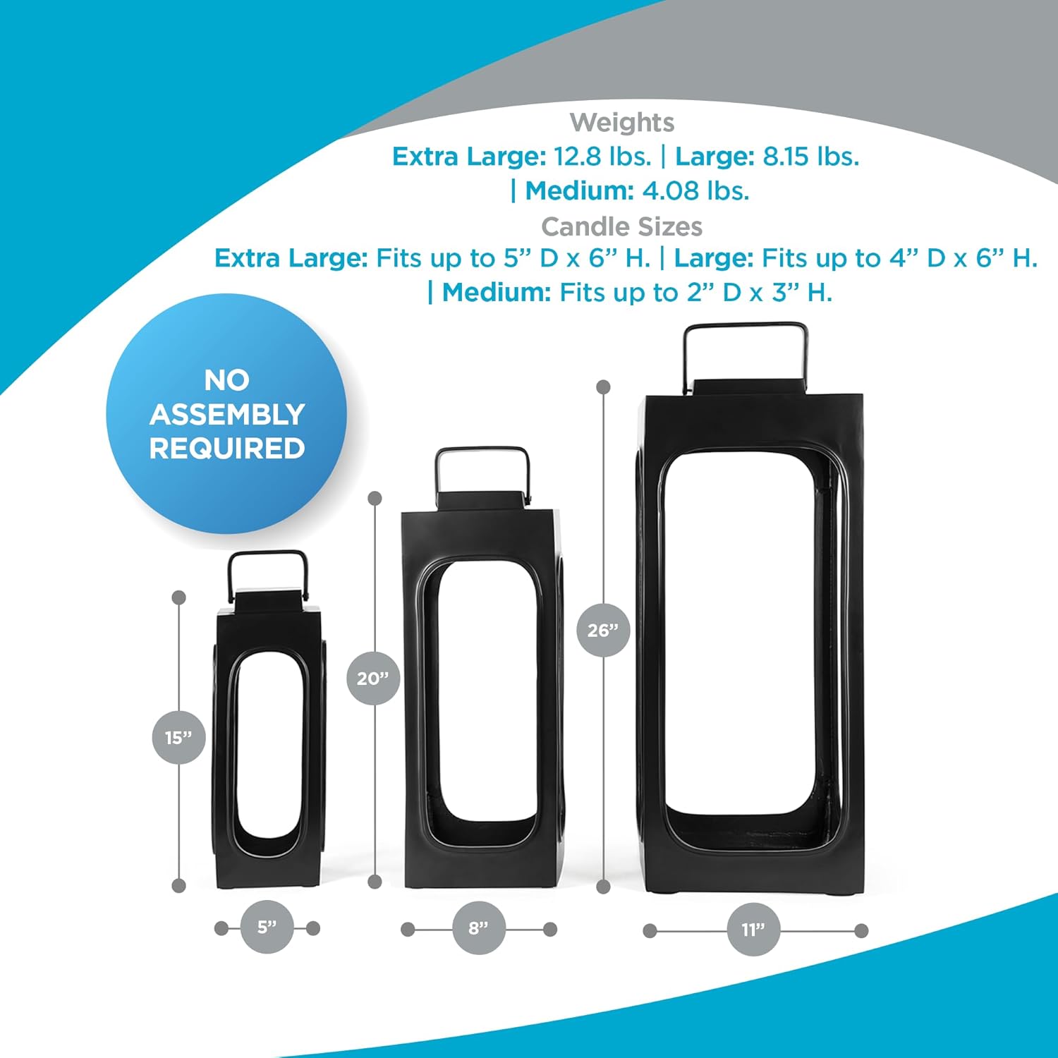Set includes Extra Large (11” L x 11” W x 26” H, fits 5” D x 6” H candles), Large (8” L x 8” W x 20” H, fits 4” D x 6” H candles), and Medium (5” L x 5” W x 15” H, fits 2” D x 3” H candles). Weights: 12.8 lbs., 8.15 lbs., 4.08 lbs. (Candles not included).