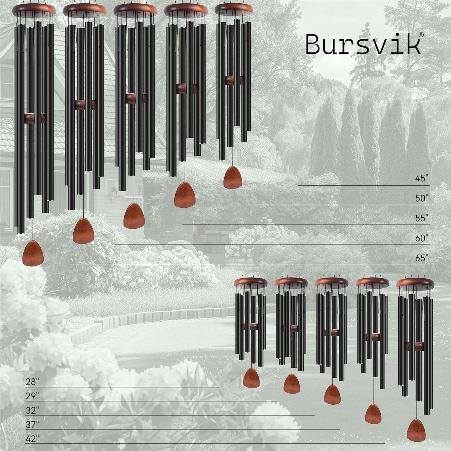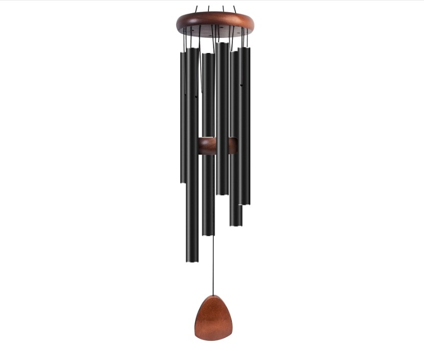 - The wind chime is made of aluminum pipe and pine. The total length of the wind chime from the top’s S-shaped hook to the bottom’s catcher is 37″ Among them, six classic black anodized aluminum tubes have excellent corrosion resistance and wear resistance, and the length ranges from 8.7″ to 12.6″. The wood is made of wear-resistant and non-cracking pine. The adjustable wooden striker allows you to adjust your favorite position at will.