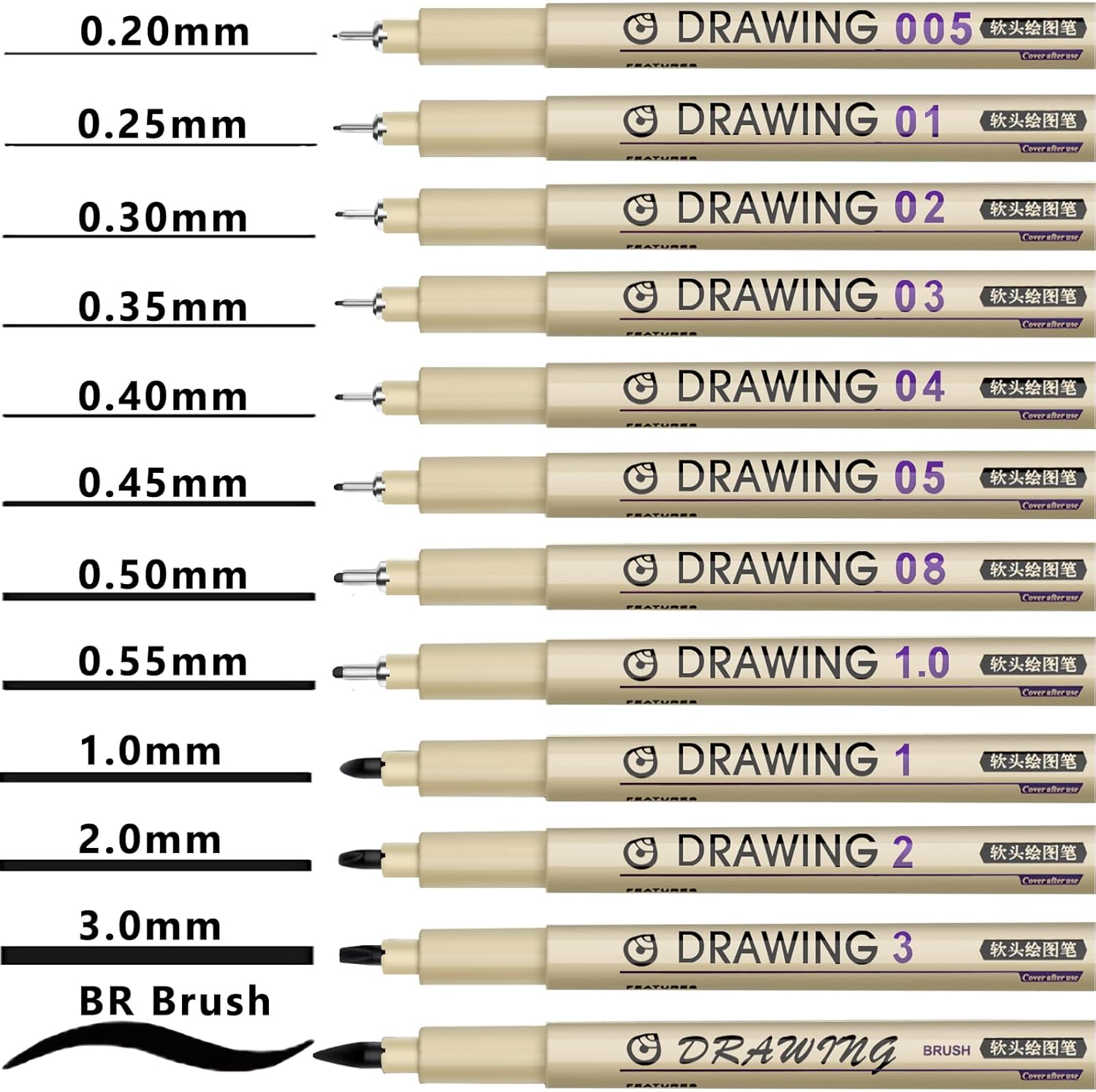 - Muchcute 12 Black Drawing Pens: The professional micro pen kit contains assorted types of pen tips from 0.2mm to 3.0mm, plus a brush tip. No Bleed, No Smear and Waterproof. Perfect for drawing and writing. One set of pens for all your art creation needs. Whether you are an artist or a beginner, you can easily use it. Line Width & Cap Size: 0.2mm (005), 0.25mm (01), 0.3mm (02), 0.35mm (03), 0.40mm (04), 0.45mm (05), 0.50mm (08), 0.55mm (1.0), 1.0mm (1), 2.0mm (2), 3.0mm (3), Brush (BR)