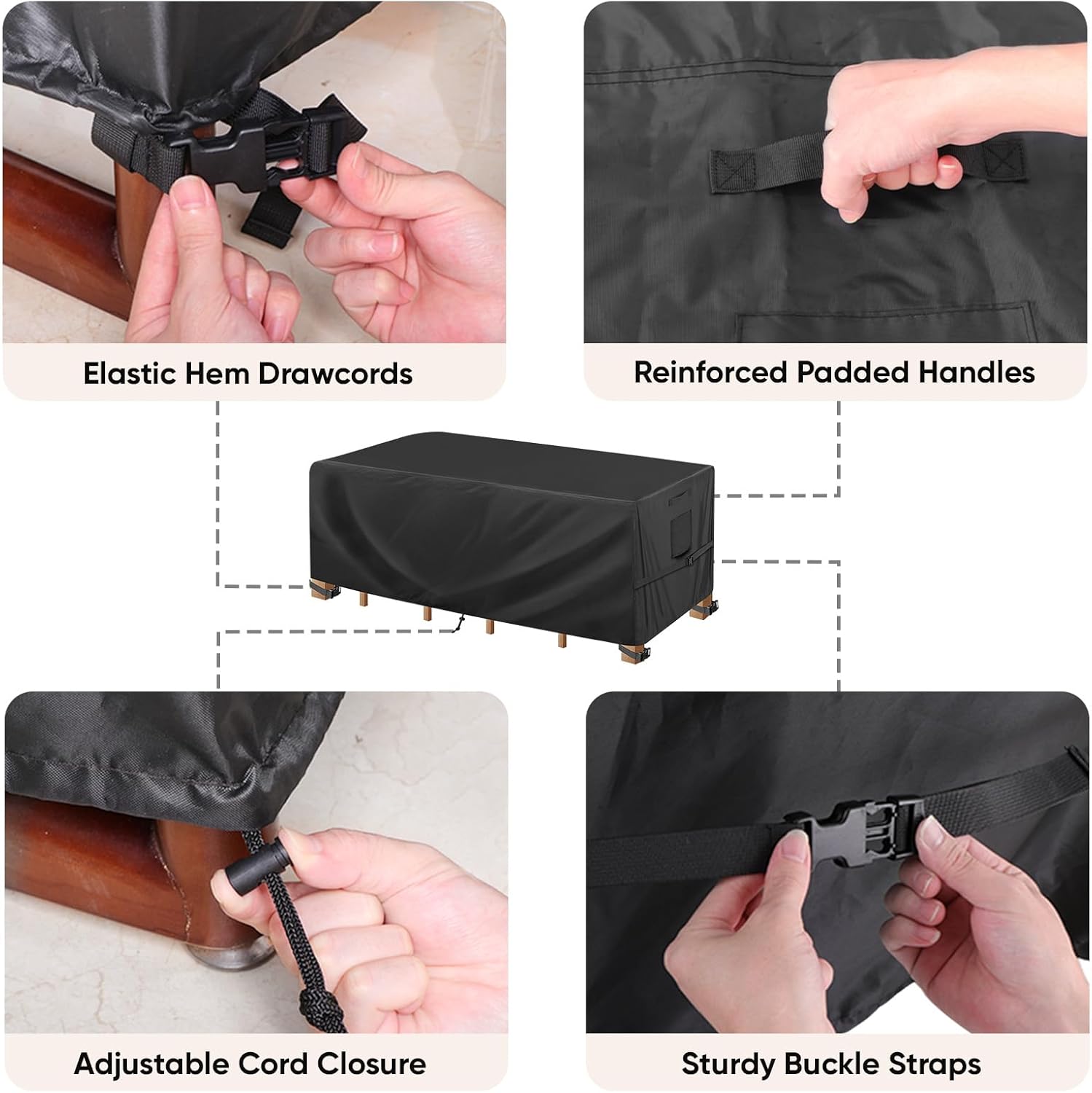• Adjustable Straps: The outdoor couch cover features adjustable buckle straps on both sides to prevent wind blowover and secure the cover in place; It also includes four straps for secure positioning; Elevate your outdoor patio furniture covers with support objects to prevent water and debris accumulation, enhancing air circulation and prolonging the cover’s lifespan
