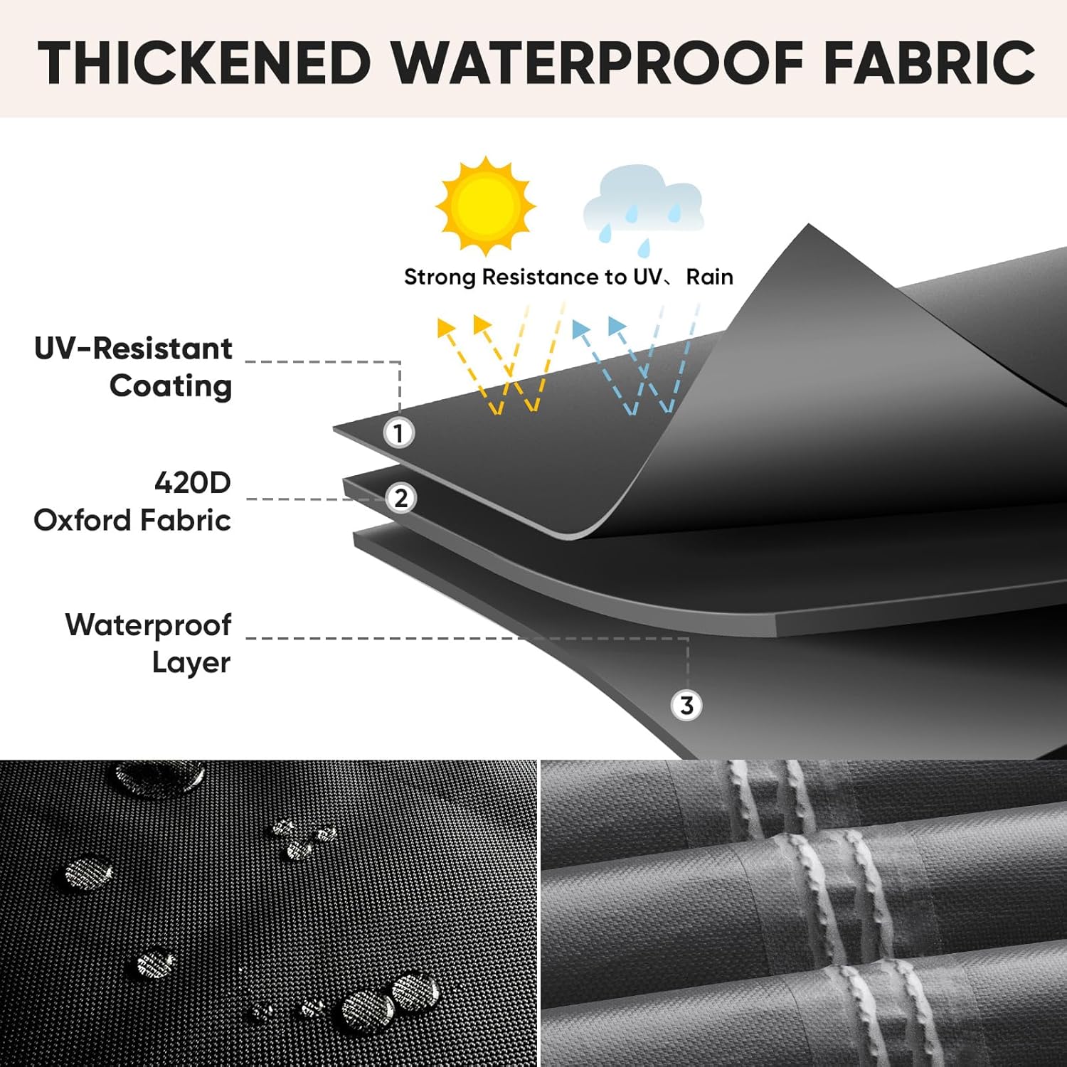 • Durable Protection: This waterproof outdoor furniture cover are crafted from heavy-duty 420D Oxford fabric with a PU waterproof coating, these covers protect your outdoor furniture from rain, snow, and dust; They’re designed to withstand all weather conditions with UV resistance, anti-fade properties, high-temperature resistance, and easy maintenance, making them ideal for year-round use