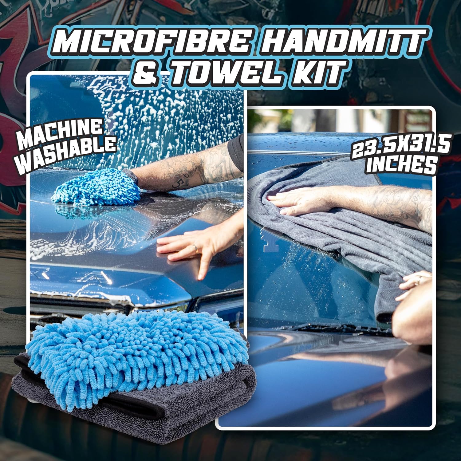 • PREMIUM TOOLS INCLUDED: Our carwash set includes 33.8oz Car Wash, 16oz Grease Attack, Interior Cleaner & Glass Cleaner, ensuring superior cleaning power for all car surfaces. Also includes a Hand Mitt, Towel Kit, and Soft & Hard Bristle Brush.