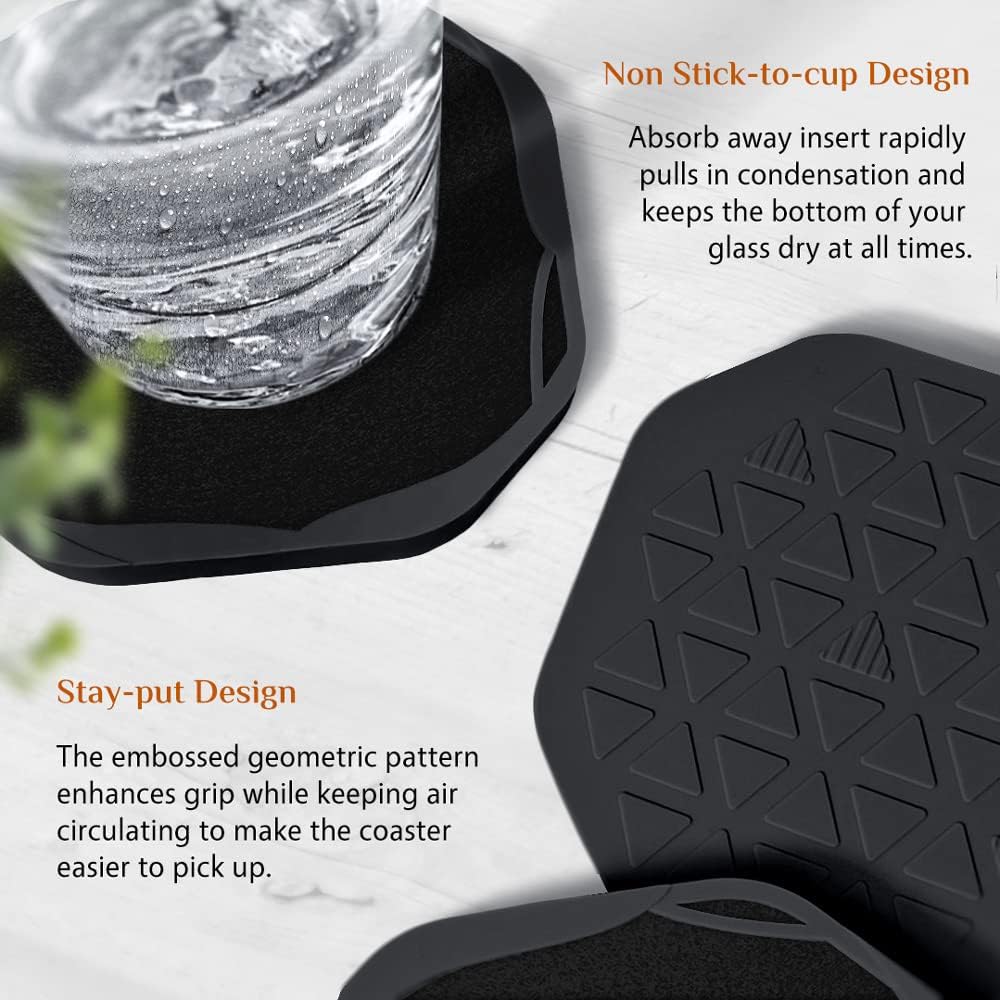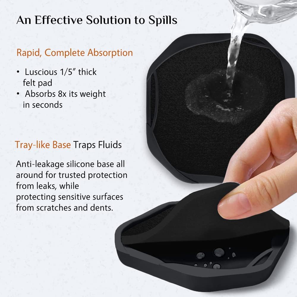 RESPECT WOOD – Featuring material mashup, it effortlessly protects your table – all day, every day [ Safe from Spills and Permanent Damage ] The 1⁄5″ thick soft felt pad can absorb as much as ¼ cup of liquid in seconds, and the silicone base offers leak-free protection while protecting your sensitive surfaces from scratches and dents [ Elevated Experience ] The embossed geometric pattern enhances grip without leaving residue while keeping air circulating to make the coaster easier to pick up